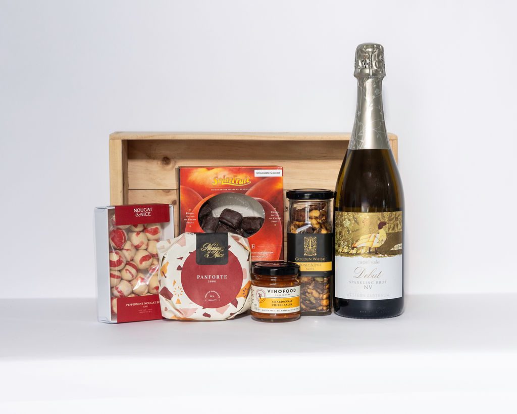 This sophisticated hamper features a bottle of Margaret River Capel Vale Sparkling Brut alongside a selection of WA-grown gourmet treats. Expect Panforte and peppermint nougat bites from Nougat & Nice, indulgent Solarfruit chocolate, Golden Whisk’s honey & spice nuts, and Paddock2Produce chilli salsa—all elegantly arranged in your choice of locally crafted wooden tray or sleek magnetic gift box.