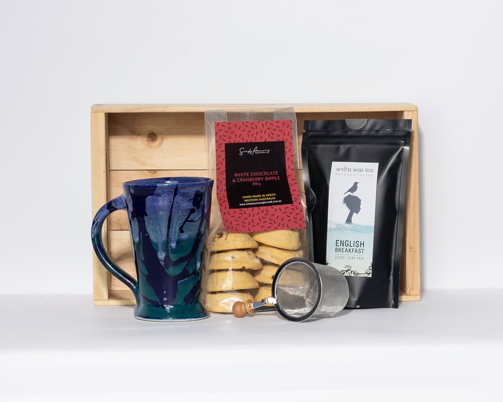 This elegant tea hamper showcases local Western Australian craftsmanship. It includes a pouch of Seven Seas premium tea (choose English Breakfast or Earl Grey), a stylish basket infuser, a handcrafted pottery mug by Pumpkin Eye, and buttery shortbread-style biscotti by Simply Amazing—beautifully arranged in your choice of wooden tray or a sleek magnetic gift box.